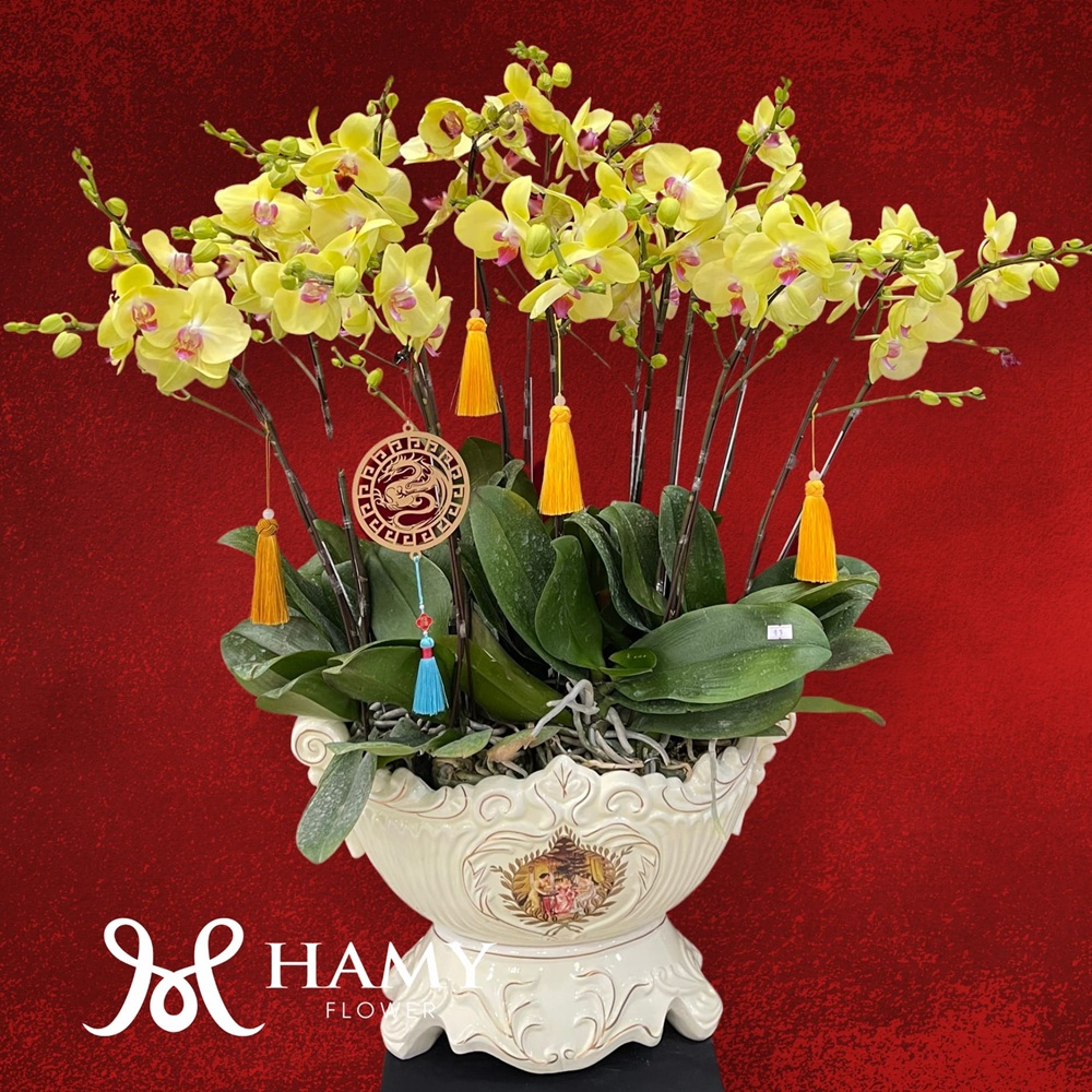 Chậu Lan Hồ Điệp mang đến vẻ đẹp trang nhã, thanh lịch và đầy ý nghĩa, kết hợp từ cành lan hồ điệp tinh khôi và sang trọng. Sự hòa quyện giữa hai gam màu này không chỉ tạo điểm nhấn thẩm mỹ mà còn mang đến thông điệp bình an, tôn kính và may mắn cho người nhận.