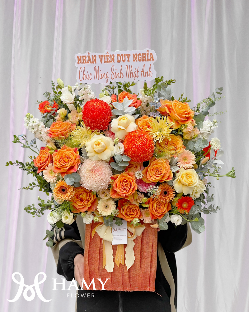 Lẵng hoa Rực Nắng An Khang gây ấn tượng mạnh với sắc cam – vàng ấm áp, được thiết kế theo phong cách hiện đại, dày hoa và cân đối.