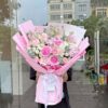 Điểm nhấn trung tâm là cúc mẫu đơn bông lớn, tròn đầy và rực rỡ – biểu tượng của sự sung túc và viên mãn. Bao quanh là hoa hồng cam mang vẻ đẹp nhiệt huyết, kết hợp cùng hoa hồng kem thanh lịch tạo nên sự hài hòa về màu sắc.